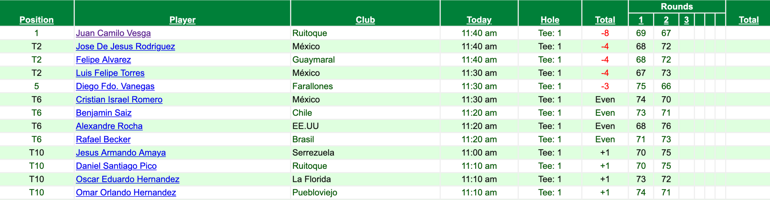 Vesga, con ronda de 67 impactos, entre los que sumó dos águilas en los pares 5 de los hoyos uno y siete, va en busca de su primer Abierto de Colombia luego de dar el salto hacia el profesionalismo hace cerca de un año y haber conseguido su primer título profesional en el Abierto del Club Hatogrande.