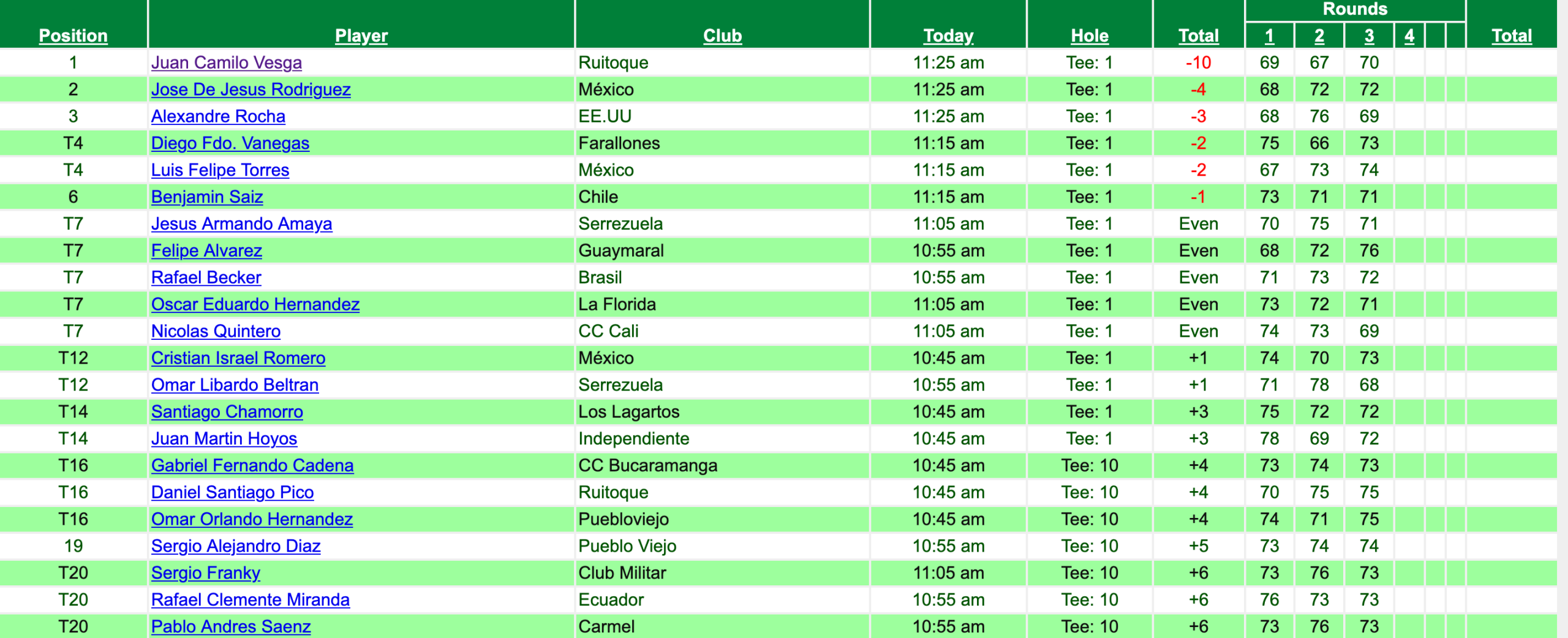 El tablero de posiciones, entretanto, sufrió algunas modificaciones, con Felipe Álvarez cayendo al séptimo lugar tras una jornada complicada en la que firmó tarjeta de 76 golpes, dejando como mejor colombiano al caleño Diego Vanegas, que empata la cuarta casilla con el mexicano Luis Felipe Torres, ambos con un total de -2.
