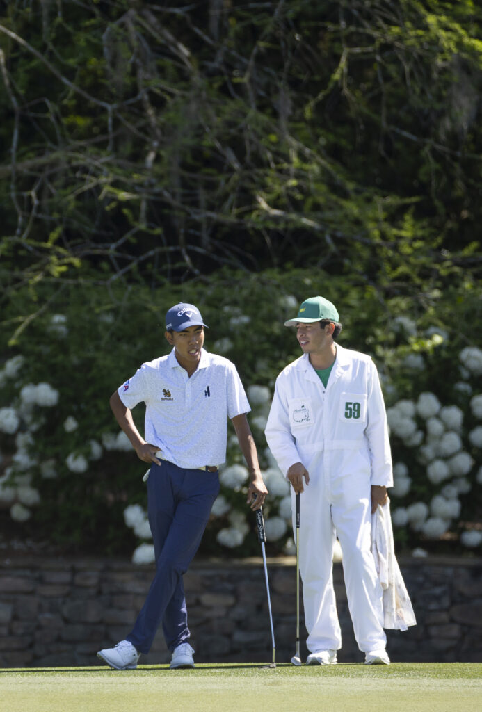 Amateur Fifa Laopakdee of Thailand and his caddie chat on the No. 11 hole during the first round of the Masters at Augusta National Golf Club, Thursday, April 09, 2026.